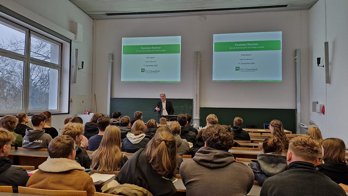 Am 18. Dezember 2025 haben vier Schulkassen aus der Oberstufe des Gymnasiums aus Rinteln die TU Clausthal besucht, um sich über Themen rund um die Mathematik zu informieren. Am Vormittag der Veranstaltung, die am letzten Donnerstag vor Weihnachten am Institut für Mathematik der TU Clausthal stattfand, haben die SWZ-Mitglieder Prof. Ippisch und Dr. Herzog über den Einsatz von mathematischen Methoden im parallelen Rechnen bzw. High-Performance Computing sowie über Methoden der stochastischen Simulation zur Optimierung von Produktions- und Logistikprozessen gesprochen. Abgerundet wurde der Besuch am Nachmittag durch einen von Dr. Kortemeyer organisierten Workshop zur mathematischen Modellierung. Das Gymnasium aus Rinteln besucht das Institut für Mathematik der TU Clausthal bereits seit vier Jahren.